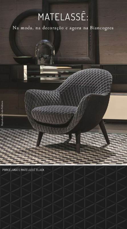 É comum ver referências da moda sendo absorvidas pelo universo da decoração – e vice-versa. Uma delas é a técnica do matelassê, imortalizada pela estilista Coco Chanel nos anos 50. O processo que agrega textura e sofisticação aos tecidos foi o ponto de partida para a criação do Porcelanato Matelasse Black, um dos mais novos lançamentos da Biancogres.