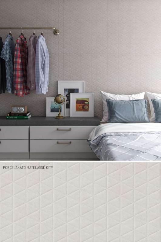 Com acabamento fosco e suaves relevos, o revestimento tem um efeito tridimensional surpreendente que reproduz com fidelidade a aparência de um tecido matelassado. Não à toa, o porcelanato foi eleito como um dos modelos mais interessantes apresentados na Expo Revestir de 2017.