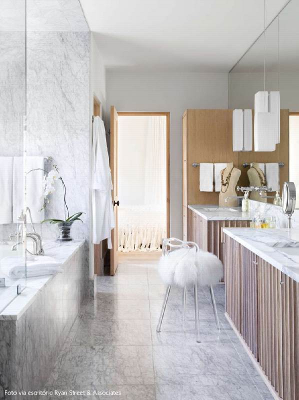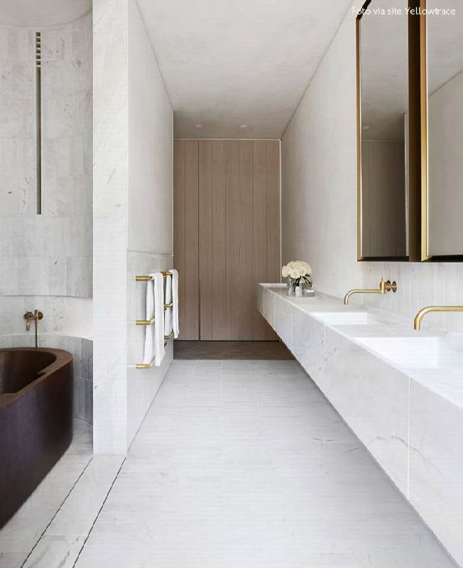 • No banheiro: Deixar o banheiro com ares mais nobres é o sonho de muita gente, então o porcelanato com efeito de mármore é um bom caminho para conquistar esse clima. Você pode combinar dois revestimentos diferentes, como o porcelanato Brocan no piso e o Calacata Cremo na parede, por exemplo, ou revestir o ambiente todo com o mesmo acabamento.